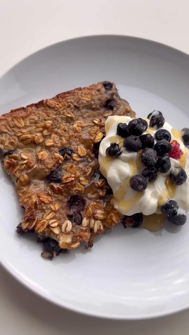A cozy and nutritious baked oatmeal featuring layered bananas, mixed berries, and a coconut-oat topping, baked to golden perfection and served with yogurt.