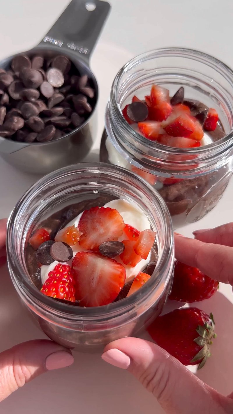This blended chocolate chia pudding, made with banana, cocoa, and maple syrup, creates a creamy, indulgent dessert, topped with Greek yogurt, fresh strawberries, and chocolate chips for a sweet and satisfying treat.