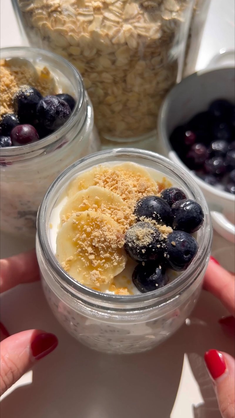 In a bowl, mix together the oats, Greek yoghurt, milk, blueberries, chia seeds, and maple syrup.