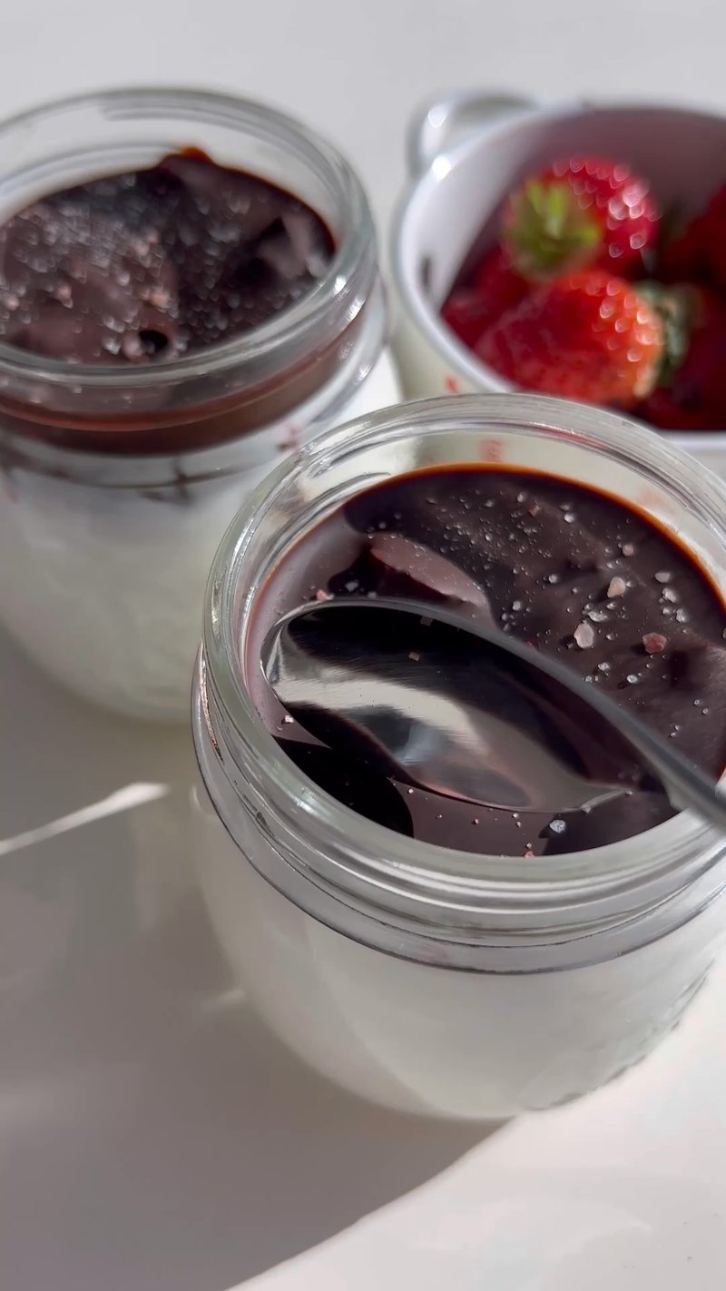 Add a layer of Greek yoghurt to a jar, followed by chopped strawberries and a drizzle of melted dark chocolate.