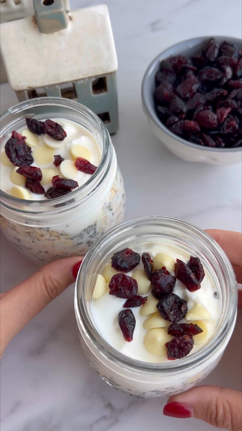 In a bowl, mix together the oats, Greek yoghurt, milk, chia seeds, maple syrup, half of the chocolate chips, and 1 tablespoon of cranberries.
