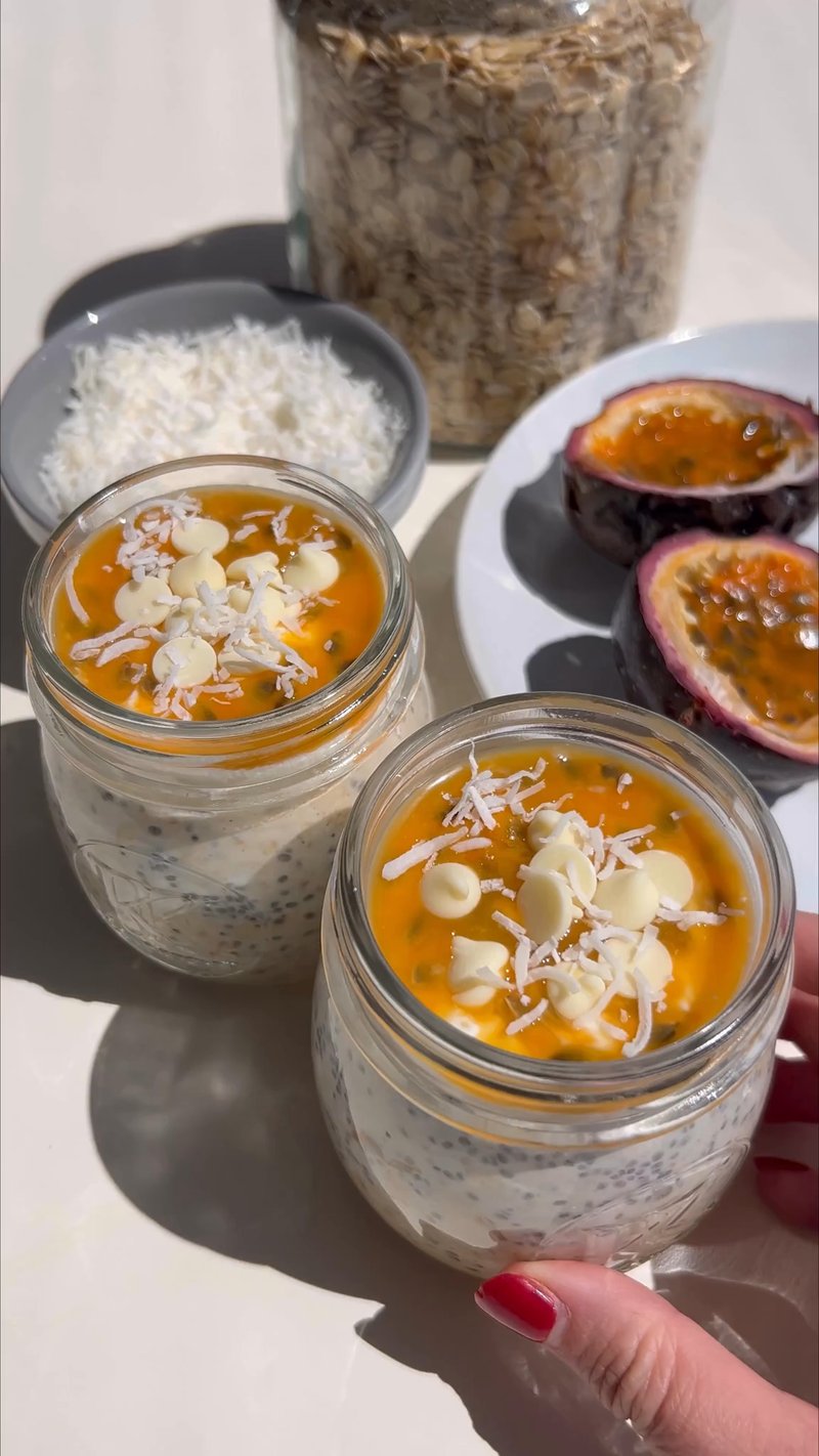 In a jar, combine the oats, shredded coconut, juice of 1/2 passionfruit, coconut milk, maple syrup, chocolate chips, and chia seeds. Stir well to combine.