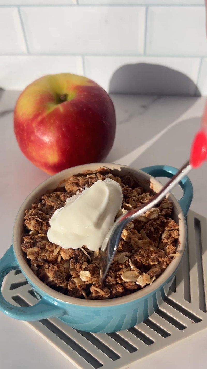 This Single Serve Apple Breakfast Crumble is a warm, comforting, and protein-packed treat, with sweet baked apples topped with a crunchy oat crumble and finished with a dollop of creamy Greek yoghurt.