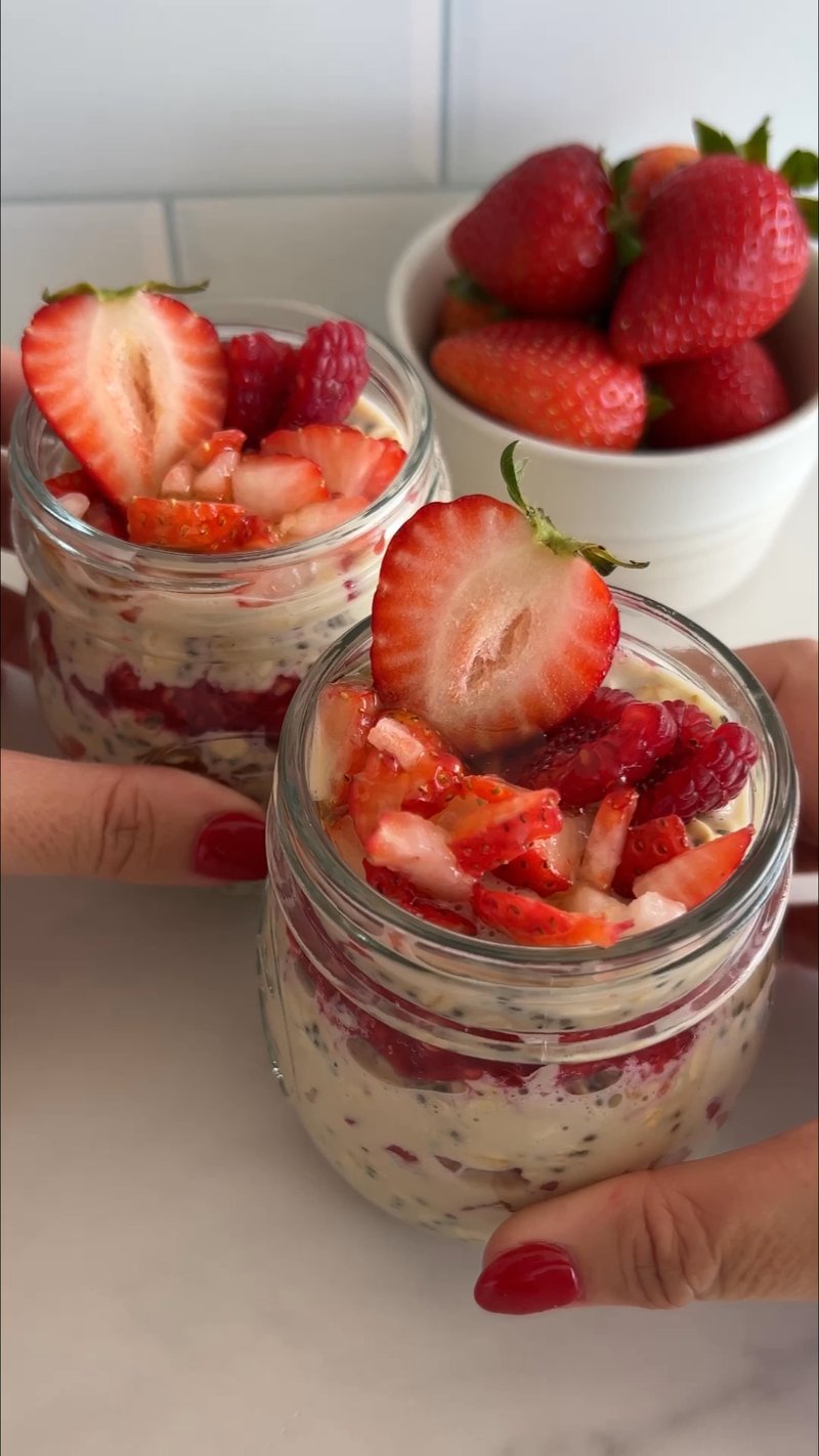 This creamy overnight oats recipe with vanilla protein powder is layered with fresh raspberries, strawberries, and a drizzle of honey for a nutritious and fruity breakfast.